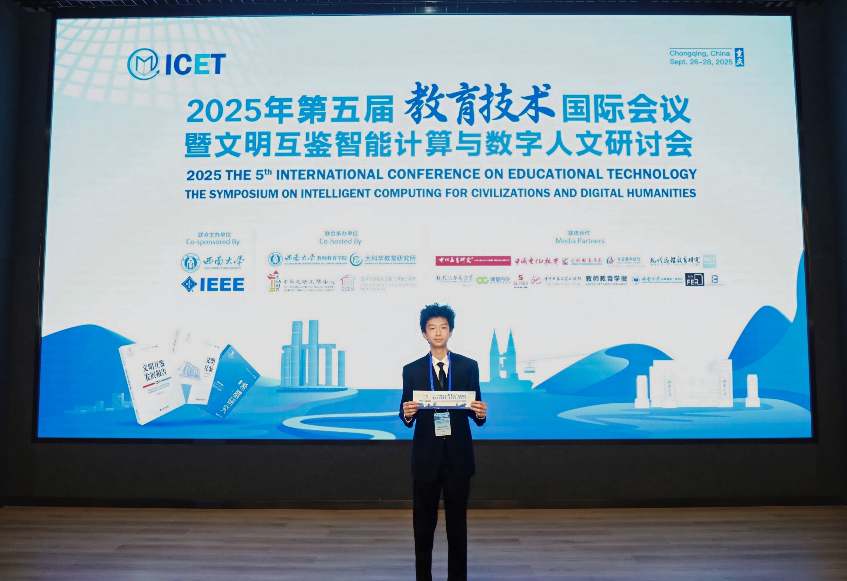 在重庆作为最年轻的参会者登台演讲,向来自日本、美国等地的大学教授和 AI 从业者展示 CAPISA 平台。离场时,两位日本学术嘉宾仍在讨论这位让人印象深刻的创业少年。