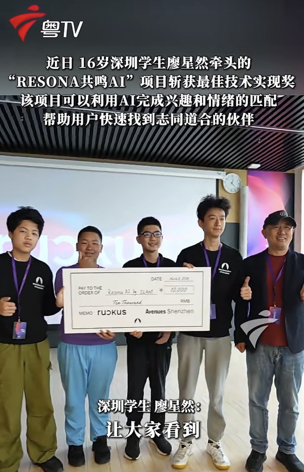 深圳南山爱文学校 RUCKUS 创新行动,44 名来自全球不同城市的青少年同台竞技,持续 43 小时。牵头的 RESONA 共鸣 AI 项目在所有参赛队伍中获得最佳技术实现奖。